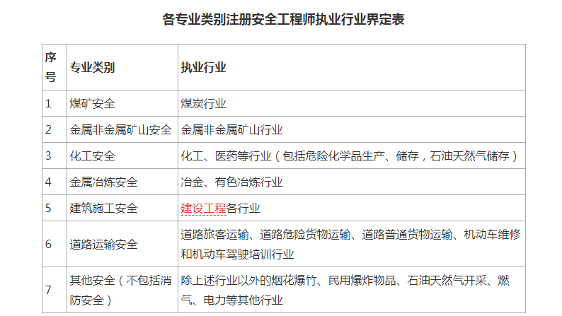 第五条 注册安全工程师专业类别划分为:煤矿安全、金属非金属矿山安全、化工安全、金属冶炼安全、建筑施工安全、道路运输安全、其他安全(不包括消防安全)。