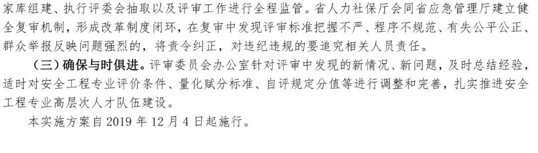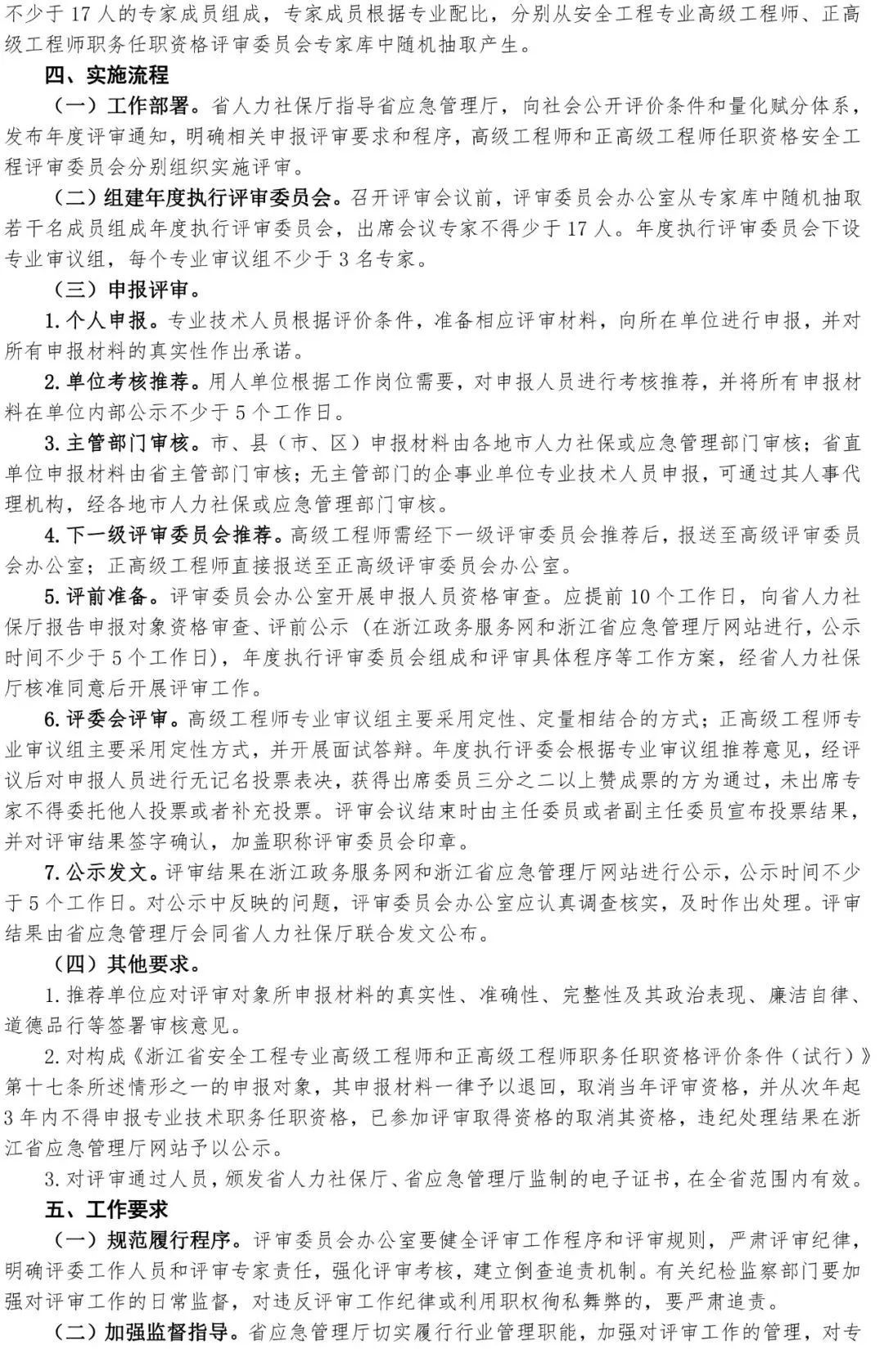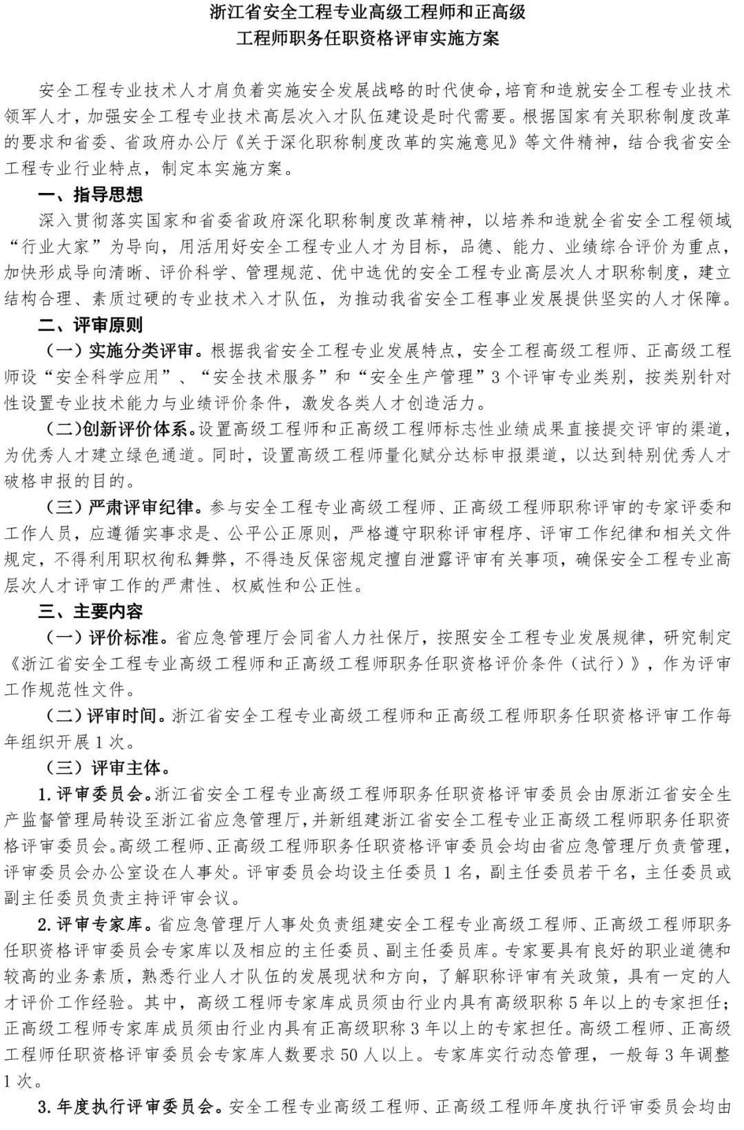 根据国家和我省职称制度改革精神,结合我省安全工程专业实际,我们制定了《浙江省安全工程专业高级工程师和正高级工程师职务任职资格评价条件(试行)》、《浙江省安全工程专业高级工程师和正高级工程师职务任职资格评审实施方案》,现印发给你们,请遵照执行,执行中遇到问题请及时报告省厅。浙江省应急管理厅 浙江省人力资源和社会保障厅
