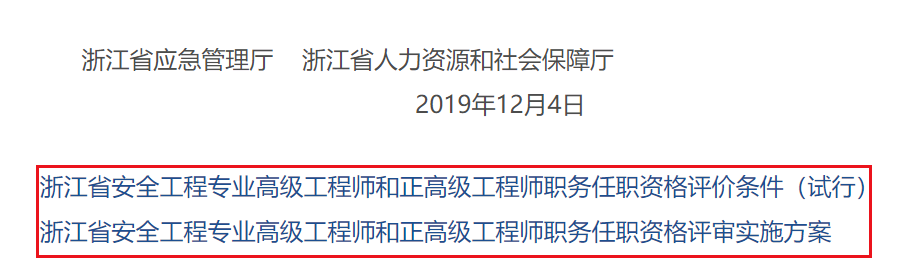 浙江省应急管理厅还发布了《浙江省安全工程专业高级工程师和正高级工程师职务任职资格评价条件(试行)》、《浙江省安全工程专业高级工程师和正高级工程师职务任职资格评审实施方案》。
