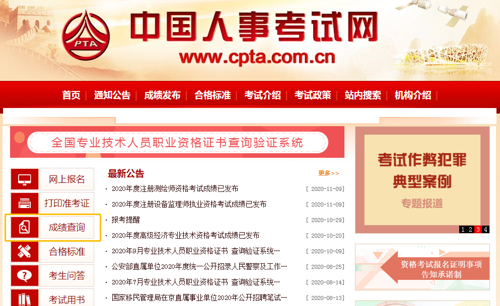 2、点击中国人事考试网首页左侧导航中的“成绩查询”,如下图: