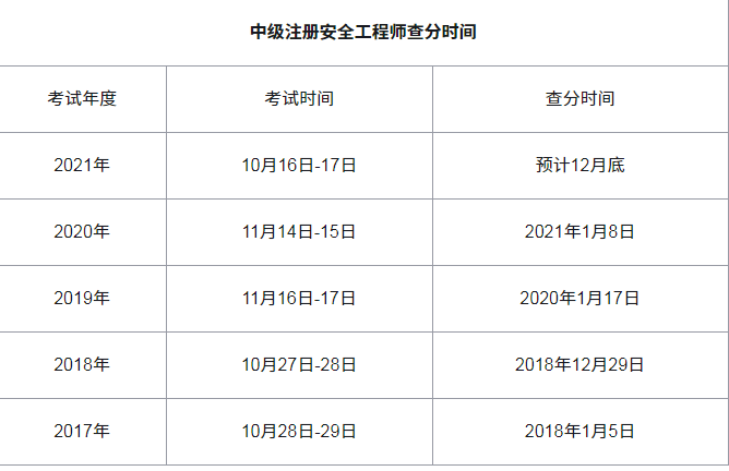中级注册安全工程师查分时间一般在考后2-3个月,小编列举近几年中级注册安全工程师查分时间参考一下: