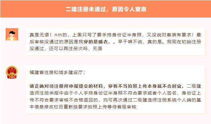 近日一名网友在咨询二建注册问题时,忍不住吐槽自己初始注册未通过的原因令人无语,怎么回事呢?接着往下看: