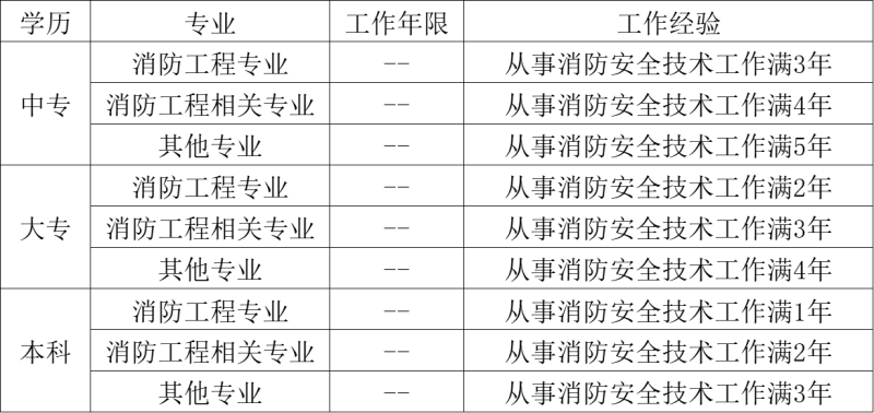 (一)取得消防工程专业中专学历,从事消防安全技术工作满3年;或者取得消防工程相关专业中专学历,从事消防安全技术工作满4年。