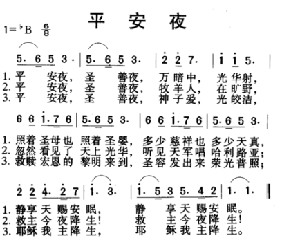 据说这首圣诞歌,是阿尔卑斯山下沙司堡的牧若瑟神父,在一八一八年撰写的歌词,曲子则是乐师方济葛鲁伯所作的。不幸它在那乡村圣堂歌咏团的抄写本中,埋没了十多年。后来,被一位喜爱音乐的人发现,就把这首圣诞歌,带到城里的音乐会上演唱,非常受人欢迎。于是平安夜 歌词,渐渐的流传到奥地利各地,再传到了德国。一八三九年,这首圣诞歌传进了美国,不到几年功夫,就普遍得到人民的喜爱。再经过著名歌唱家的演唱,电台的播放,这首圣诞歌-平安夜,普遍的流传世界,而且各国都有翻译的歌词。不管是不是基督徒,几乎都熟悉这首“平安夜”,聆听的时候,而且会哼唱起来。