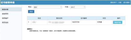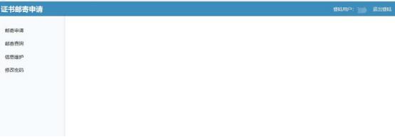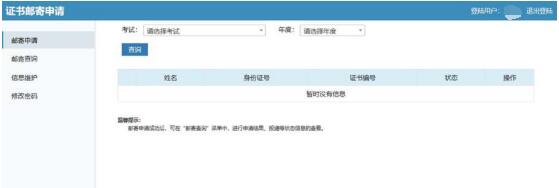 进行具体考试邮寄申请时,选择左侧菜单中的“邮寄申请” 项。点击后操作界面如下图: