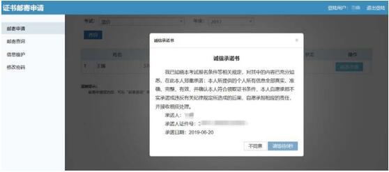 系统会首先有“诚信承诺书”的显示,以及操作倒计时。倒计时结束后,点击“同意”按钮,系统处理后,将转到邮寄申请信息录入的界面。具体如下图: