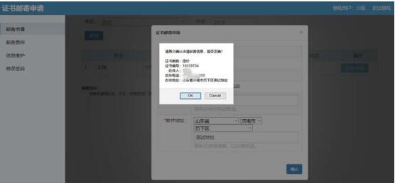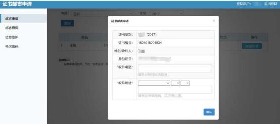 考生如实填写收件电话、收件地址后,进行“确认”。系统将会有信息的再次确认。操作界面如下图: