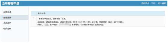 点击“确定”按钮后,系统将做邮寄申请信息的记录,并返回处理结果。点击后的操作界面如下图: