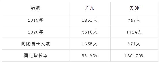 上面是分析了通过率,紧接着以广东、天津这两个地区为例,对2019年和2020年一造合格人数变化情况进行分析: